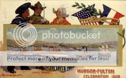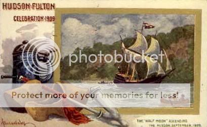 Celebrations like Hudson-Fulton were yet another arena for specialized postcards. Cards with images of the parade, and the figures to which it was dedicated served both as collectibles and witnesses to the experiences of those who were present at the event. Postcards from the celebration were often portraits of Hudson, Fulton, images of the Clermont, the Half-moon, or illustrations of various floats in the parade. Pictures of floats depicting Native Americans and literary themes were popular for their fantastical appeal. Often Hudson and Fulton were shown in a small bust portrait next to a picture of one of their vessels on the water.