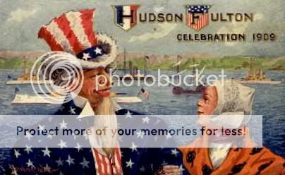 historical events and more inventive scenes were depicted in postcards. Dutch shoes, or a little Dutch girl, appear next to Uncle Sam in some postcards, while others show Henry Hudson approaching the Native Americans for the very first time after disembarking from the Half-Moon. Postcards from 1909 were full of imagination and brightly colored busy scenes. Often patriotic colors such as red, white, and blue were used. Most postcards sought to be as eye-catching as possible, and such themes were popular with tourists looking to send something exciting back to their loved ones which would commemorate the event and show how the parade actually looked.